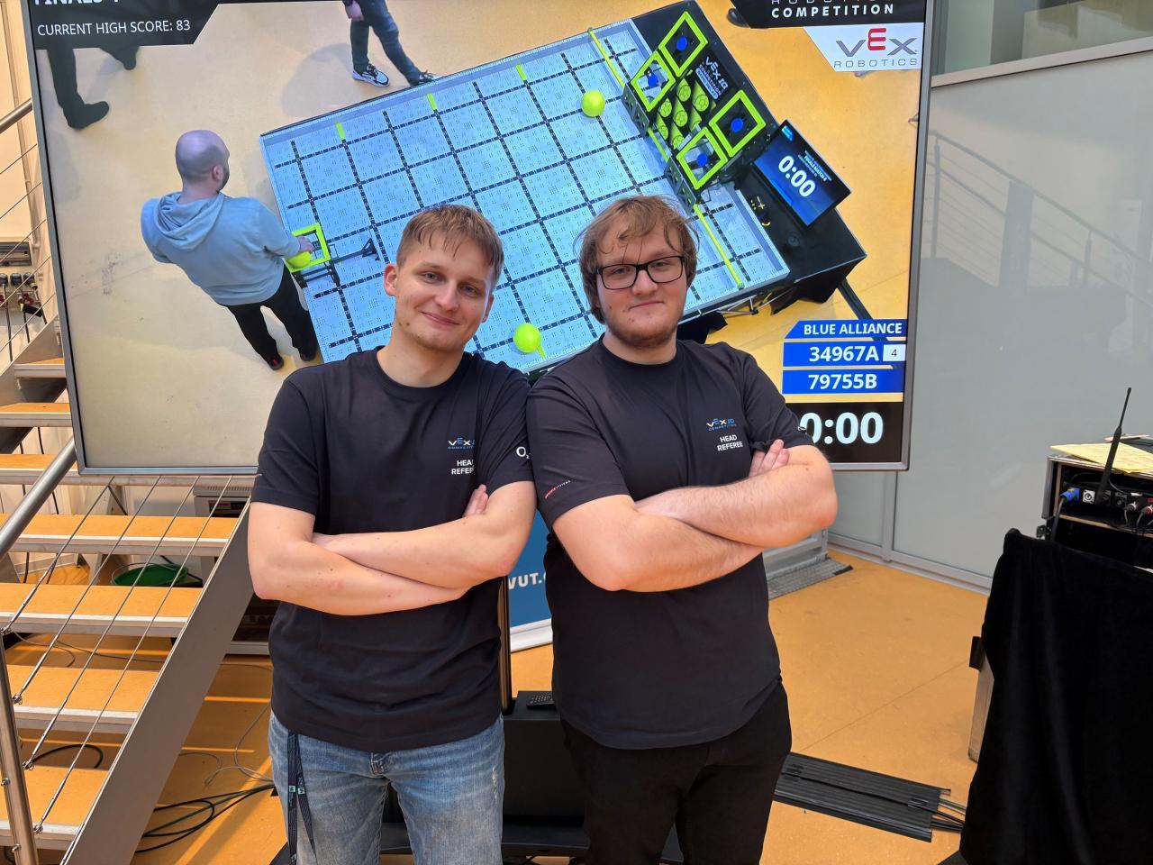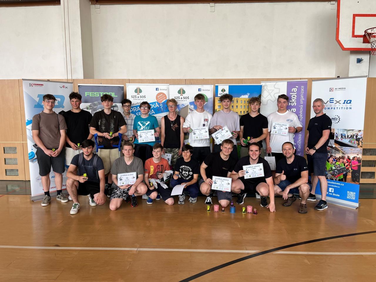 S trenérem a koučem Ing. Alexandrem Falesem jsme dorazili do tělocvičny na Střední zdravotnické škole a Střední odborné škole v České Lípě, kde jsme s ostatními týmy ladili strategie, pravidla a poslední detaily. Všechny týmy se svými roboty prošly inspekcí jako profíci – všechno podle pravidel, všechno originál VEX IQ, tak jak to má být.