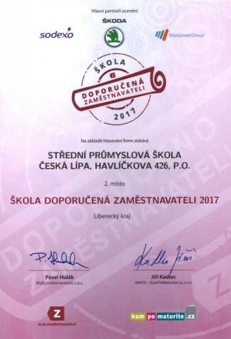 Střední průmyslová škola Česká Lípa získala opětovně hodnotný titul „Škola doporučená zaměstnavateli 2017" udělený zástupci firem z České republiky a v letošním roce obsadila v Libereckém kraji krásné 2. místo. V soutěži hodnotí přední zaměstnavatelé střední školy, jenž nejlépe připravují své absolventy na zaměstnání a jejich budoucí kariéru.