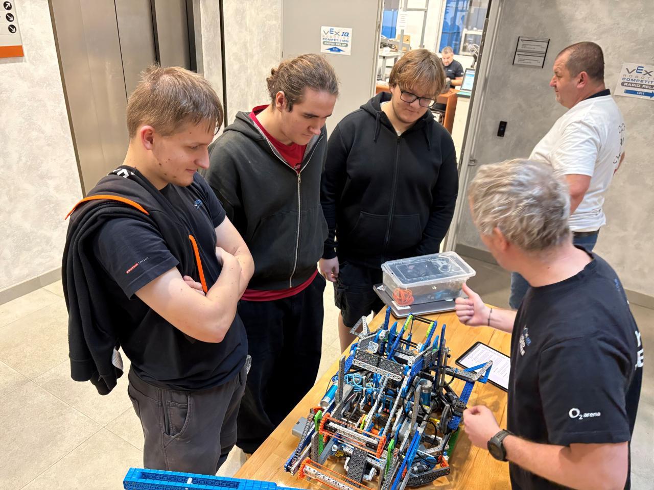 S trenérem a koučem Ing. Alexandrem Falesem jsme dorazili do tělocvičny na Střední zdravotnické škole a Střední odborné škole v České Lípě, kde jsme s ostatními týmy ladili strategie, pravidla a poslední detaily. Všechny týmy se svými roboty prošly inspekcí jako profíci – všechno podle pravidel, všechno originál VEX IQ, tak jak to má být.