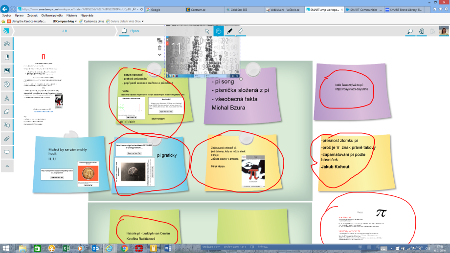 Global Collaboration však nemusí být aktivita určená pro propojení studentů či žáků s cizinou. Připravuji v současné době oslavu dne PÍ. Spolupracuji se dvěma školami (ZŠ Dubá a ZŠ Stráž pod Ralskem) a propojíme tak první, druhý stupeň ZŠ a SŠ, abychom se na číslo PÍ podívali z pohledu všech stupňů školství. Že chybí vysoká škola? Máte pravdu, zato nám přislíbil účast doc. RNDr. Tomáš Vejchodský, Ph.D.,který pracuje v Matematickém ústavu Akademie věd ČR. Při přípravě na oslavu PÍ využíváme se studenty již zmíněný SMART amp a SMART Bridgit.